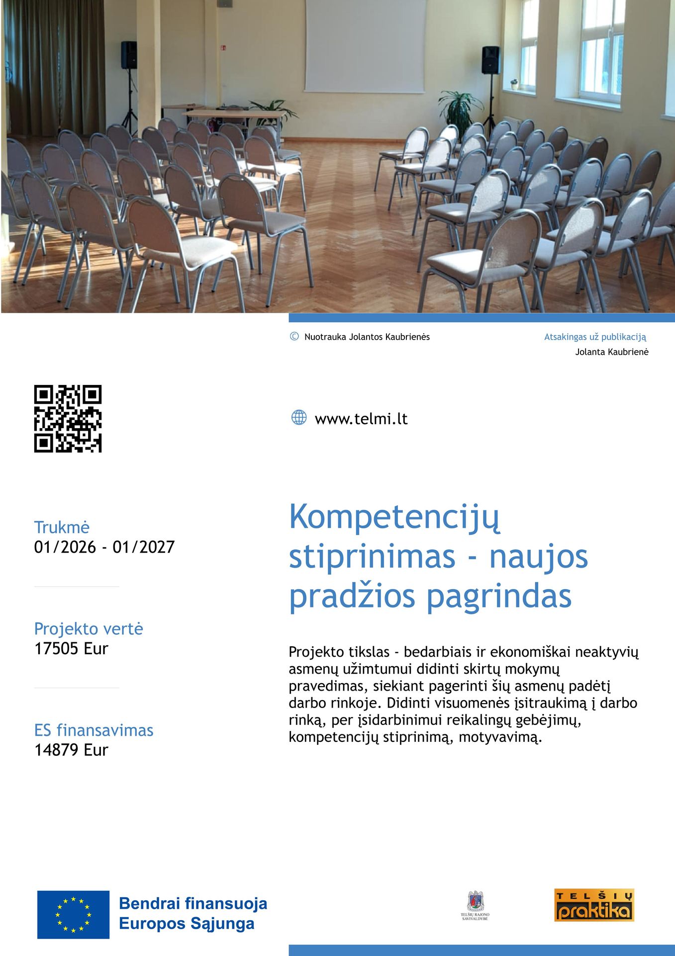 Startuojame su projektu „Kompetencijų stiprinimas – naujos pradžios pagrindas“. Projekto tikslas – bedarbiai ir ekonomiškai neaktyvių asmenų užimtumui didinti skirtų mokymų pravedimas, siekiant pagerinti šių asmenų padėtį darbo rinkoje. Didinti visuomenės įsitraukimą į darbo rinką, per įsidarbinimui reikalingų gebėjimų, kompetencijų stiprinimą, motyvavimą.
